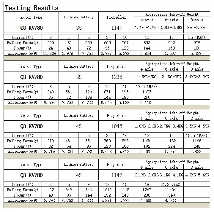 KV: 780KV Net weight: 93g Stator size: 31 x 10mm Motor size: Φ37.2 x 28mm Idle current: 0.5A @10V Cell number supported: 3-4S Lipo Max continuous current: 26A Max continuous power: 490W Internal resistance: 0.158Ω