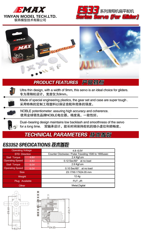 | Tags: EMAX ES3352 12.4g 2.8kg .10 sec Metal Gear Digital Servo for glider |