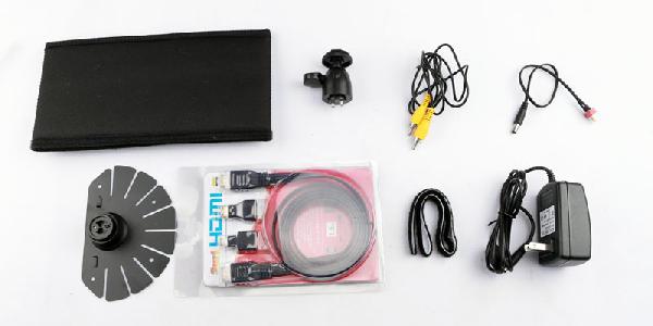 Includes: 1 x monitor with base 1 x sunlight shield 1 x 12V AC adaptor 1 x AV cable 1 x HDMI cable including various conversion connectors 1 x DC input wire