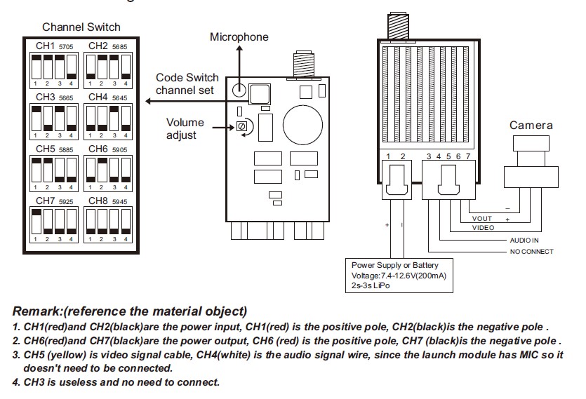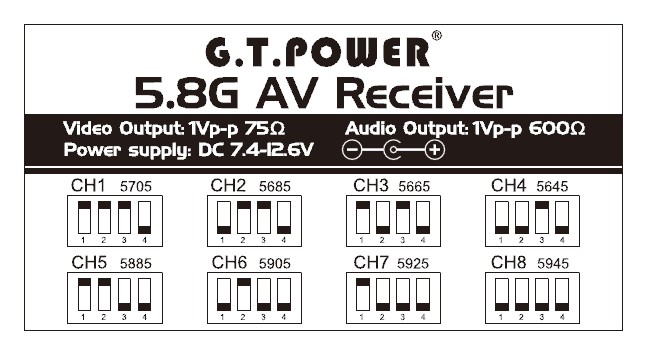 Channels 5.8G : 5705,5685,5665,5645,5885,5905,5925,5945 MHZ