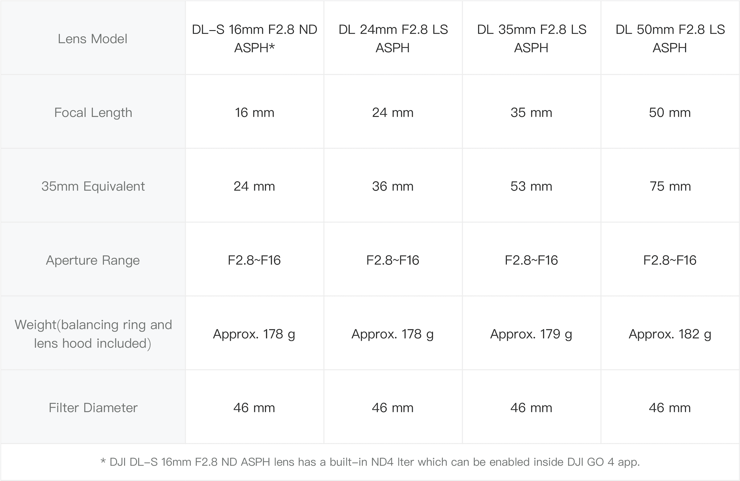 DJI DL/DL-S Lenses are professional prime lenses specially designed for aerial photography. Featured light-weighting carbon fiber casing, those lenses are able to reduce the payload of the gimbal and camera, improving the stability when shooting. With the DJI DL mount (diameter: 58mm), the lenses can be mounted onto Zenmuse X7, providing varying focal lengths. When used with Zenmuse X7, the focal length multiplier is 1.5 when taking stills.