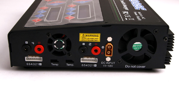 AC Input voltage range 220V/110V switchable DC Input voltage range DC 11.0V~18.0V Charge current range 0.1A~10A Discharge current range 0.1A~2.0A Charge power limited 100Wx4 Discharge power limited 10Wx4 Energy transfer discharge: max 400W Balance tolerance ±0.01V Balance current: max 500mA NiCd/NiMH battery cell count 1~16cells Lithium battery types Li-Po, Li-ion,Li-Fe Lithium battery cell count 1-6series Pb battery voltage 2V~20V Dimension: 243 x 191 x 67mm