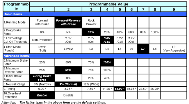 (* The programmable items and the default settings maybe changed in different firmware versions without prior notification.)