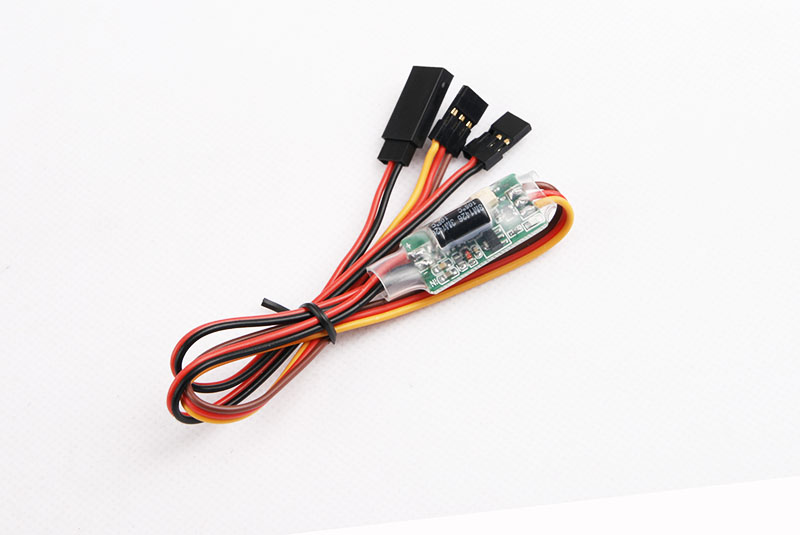 As soon as it is connected with power, LED light will blink 10 times and then enter normal working mode, right after plug the signal wire of the device onto whatever switch channel on transmitter, it starts controlling the onboard electric device through this channel of the transmitter, when the switch is on, it starts powering the onboard electric device, it enters low power consumption mode after 5 seconds, at the same time the LED light blinks slowly ( Light is off within 900 milliseconds, light is on within 100 milliseconds)