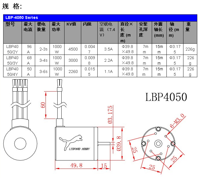 LBP4050/4Y | 50A | 3-6s | 1000W | 2260 | 0.0155 | 1.1A | Φ39.8×49.8 | 7mm | 15mm | Φ3.175 | 226g |