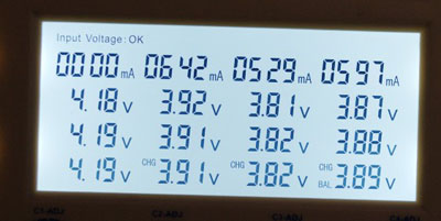 1~4 packs of 3 cells Li-Polymer batteries can be chargerd at one time without same pack capability and cell voltage, there are 4 balance modules in the X304 Quad and provides 0.5~4A for every pack solely.
