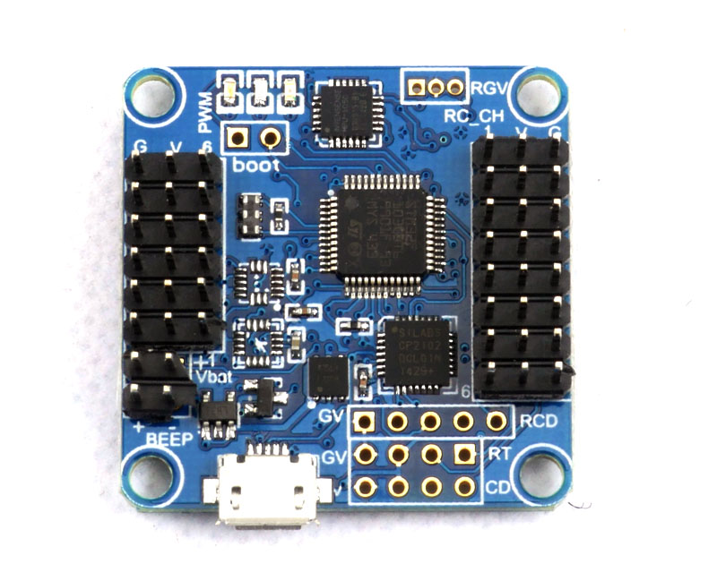 • 36x36 mm • 3-axis MEMS gyro + accelerometer (MPU6050) • Flexible motor outputs, support various airframe types • Quad/Hexa/Tri/Bi/Y4/Y6/Octo/Camera Gimbal. (Default is Quad-X) • Up to 8 ch RC input - supports standard receivers (PWM), PPM Sum receiver (FrSky, etc), or Spektrum Satellite receiver. • Battery voltage monitoring • Modern 32-bit processor running at 3.3V/72MHz (STM32F103CB). • Onboard MicroUSB for setup and configuration • configuration software for easy setup • rev4 hardware