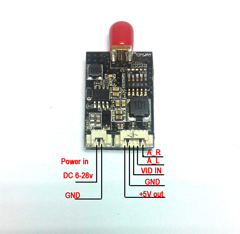 Transmitter channel number: 32-ch Power input: 6-28V DC Transmitting power: 600mW Transmitting current: 260mA @12V Audio: stereo (left and right channels are separated) Transmitter unit Dimension: 31 x 21x 8mm Weight: 11g (excluding antenna) Antenna connection: SMA jack (modules side) Refer to here for connector type diagram
