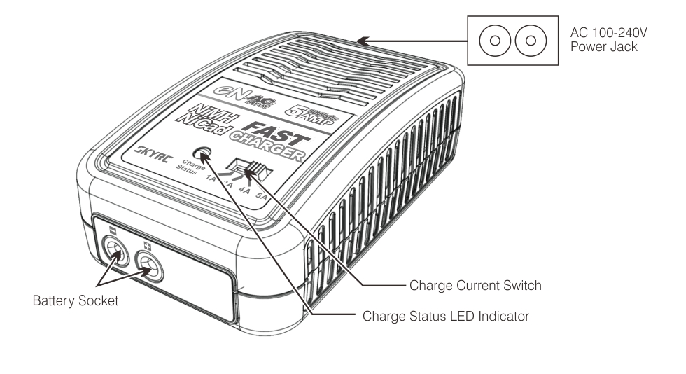 SKYRC eN5 NiMH/NiCd Charger is an economic, high quality 100-240V AC charger, designed for charging NiMH and NiCad batteries from 4-8 cells. The circuit power is 50W and max charge current can reach to 5A. There are four kinds of charge current 1A/2A/4A/5A that can be selected. You could select the proper charge current according to battery capacity.
