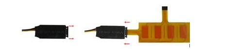 Lift the locking tab on both sides of the port, insert the sensor film and press the locking tab back into place to secure the sensor film in the circuit board. Confirm the orientation is correct.