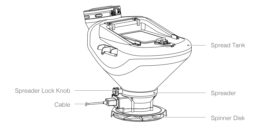Use the DJI MG app to set parameters such as hopper outlet size and spinner disk rotating speed. These parameters can be adjusted to meet different application requirements. The DJI MG app provides empty tank warning notifications. The app also provides warning notifications for abnormalities in rotating speed, temperature, and hopper outlet size. These warning notifications help ensure system safety.