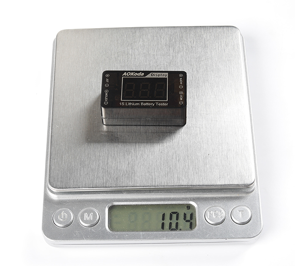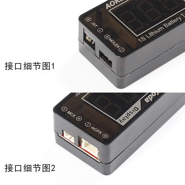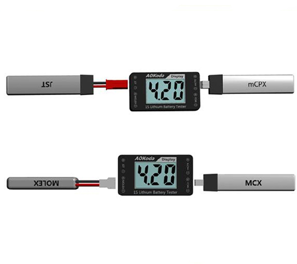 AOKoda AOK-041 1S Lithium Battery Tester (compatible with JST/ MOLEX/ mCPX/ MCX Plugs) 1.Support battery section: 1Cell 2.Voltage detector power: 0.05 W 3.Support battery type: LiFe 3.3V/LiPo 3.7V / Li-Hv 3.8V 4.Battery voltage input range: 2.50~4.35V @1Cell LiFe, LiPo, Li-Hv 5.Detection accuracy of voltage: 3.65V±0.01V, 4.20V±0.01V, 4.35V±0.01V 6.Voltage display: 0.36 inches red digital tube display, static display, unit V 7.Battery interface: JST(2.54mm), MOLEX(2.0mm), mCPX(2.0mm), MCX(1.25mm) 8.Product dimensions: 43x23x15mm 9.Product weight: 10g