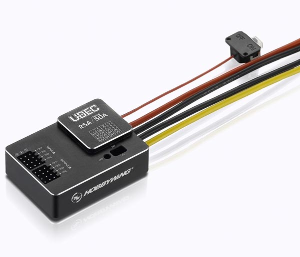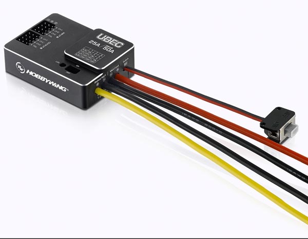 Introduction The UBEC is an external switching-mode DC-DC regulator chip. It draws the DC voltage from a 3-18S LiPo battery and drops the voltage to a level suitable for receivers and other electronic devices and keeps providing the stable current output of up to 25Amp. The UBEC has such a powerful output capability, so it is particularly applicable for the large helicopters or fixed-wing aircraft which use several servos.