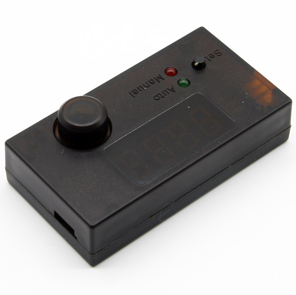 How to use: 1. Press the “Set” switch to put the device in AUTO or Manual mode. After battery and 1 to 3 servo connected to the device you decide the mode you will like to use. 2. In Auto mode function the GREEN LED will lit; device will generate automatically full range pulse and servo/s will start to swipe from full CW to CCW continuous, the digital display will show the numbers going from one end of the spectrum to the other. 3. In Manual mode the RED LED will lit; device will allow you to move the servo to your desired position by rotating the round knob, display will indicate the pulse width at that position.
