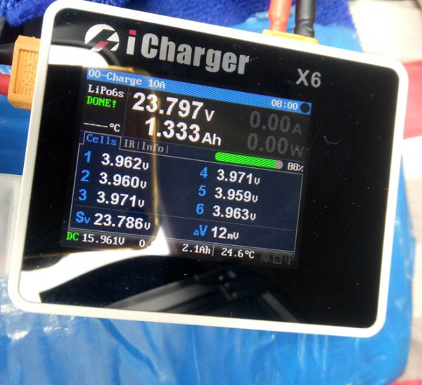 The highest power density charger on the market, the X6 is an 800W charger capable of a full 30A rate on LiPos up to 6S. With a balance current of a full 2A, charges will finish faster than ever. The full color IPS display provides a wealth of information at a glance, using the operating system perfected on the larger Duo iChargers.