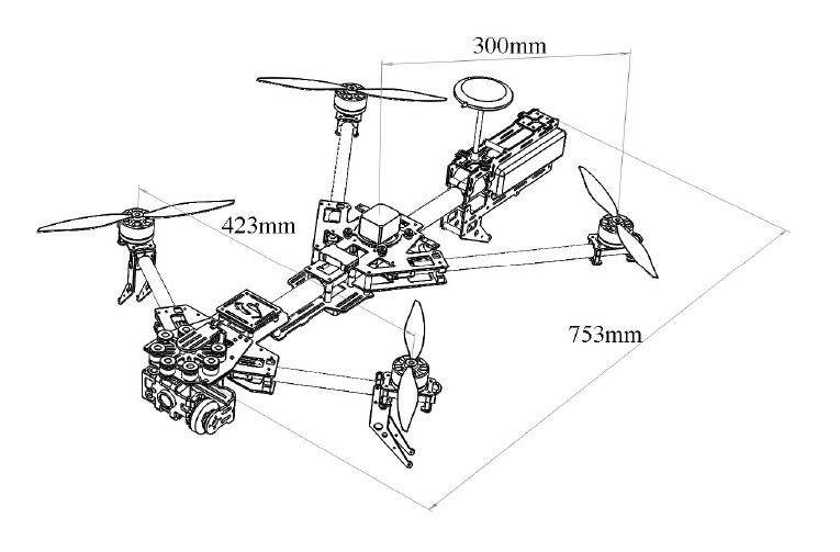 Material: 3K carbon Central plate thickness: 2mm Flight weight: 2.5 - 3.5Kg Dimension: 75x x 423mm Folding up dimension: 787 x 203mm Empty frame weight: 580g (excluding gimbal) Gimbal weight: 200g (excluding camera)