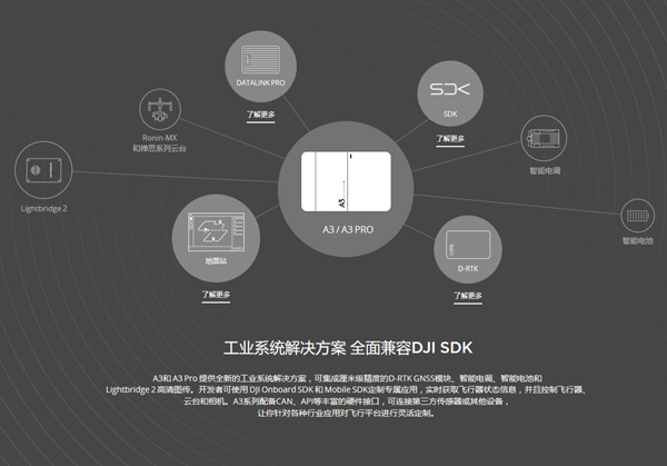 The A3 series provides industry solutions with D-RTK GNSS, smart ESCs, intelligent batteries, and Lightbridge 2. With Onboard and Mobile SDKs, custom-built applications can access flight data, and control the aircraft, gimbal, and camera. Dedicated hardware interfaces including CAN and API ports allow industry experts to craft their ideal aerial system by adding actuators and sensors.