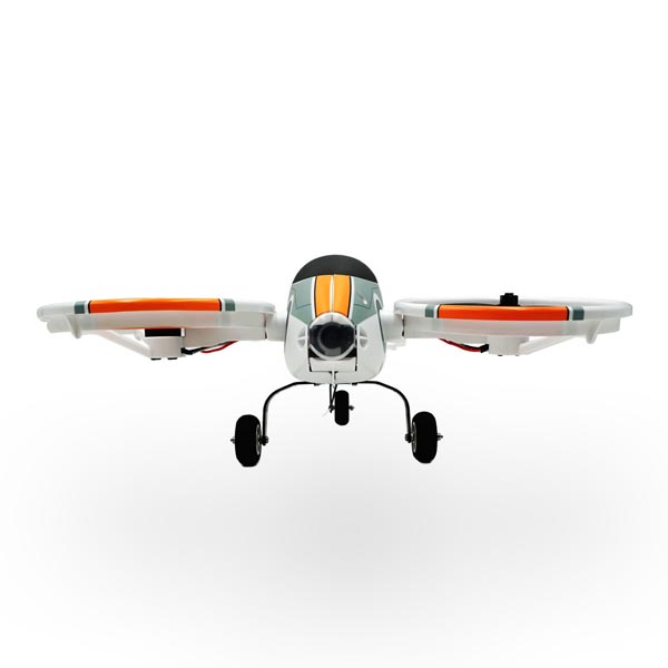 Dual servos steer the front rotors on this one-of-a-kind Tricopter. It also has a unique fuselage with a high-visibility color scheme for easy orientation while flying line-of-sight. Mounted wheels allow for the tricopter to taxi on the ground and perform smooth landings and impressive touch-and-goes.