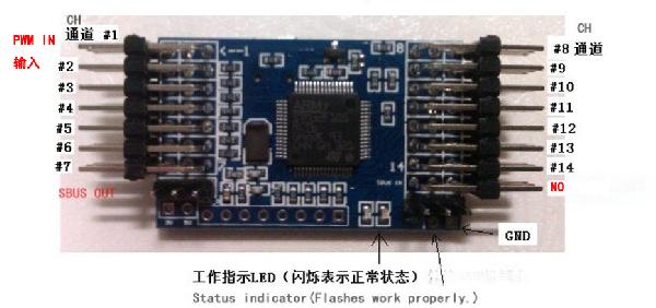 Suit for converting signal from conventional PWM signal receivers to Futaba S.bus signal, you can use none-S.Bus signal receivers with fly control like DJI etc which using S.Bus connection.