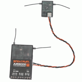 A second remote receiver (SPM9545) can be added to the system to increase the receiver’s view of the RF link. This option might work well in giant scale aerobatic planes or jets where installations become challenging. Remote receiver extensions are available in 6”, 9”, 12”, 24”, and 36” lengths to provide a variety of installation options.