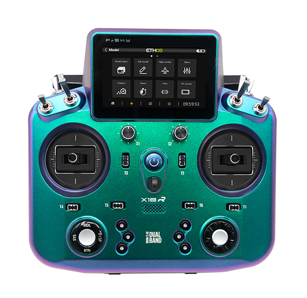 X18RS uses the upgraded 800×480 resolution screen with great visibility under sunlight. The primary components, including trim caps and knobs, are all made from metal, offering rugged quality and enhanced durability for outdoor use. The MC18 Gimbals are also CNC metal mechanized and can be adjusted to a 45° travel position from the original 60° setup out of the box.